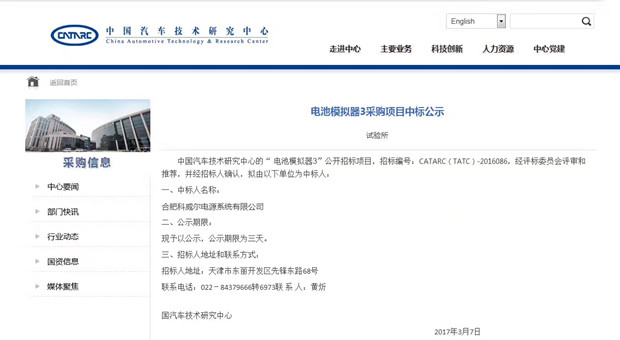 中国汽车技术研究中心2017年3月7日公告,合肥乐鱼电源系统有限公司中标中国汽车技术研究中心“电池模拟器2”(招标编号:CATARC(TATC)-2015085)、“电池模拟器3”(招标标号:CATARC(TATC)-2015086)项目。